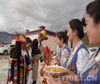 圖為瓊結鎮(zhèn)扶貧干部自發(fā)組織向搬遷群眾敬獻青稞酒。攝影:曲杰