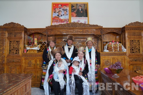 圖為在多頗章鄉(xiāng)嘎東團結新村搬遷點,旦增老人一家在新房客廳里留影。攝影:曲杰