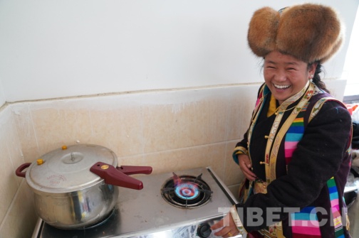 圖為在多頗章鄉(xiāng)嘎東團結新村搬遷點,瓊結鎮(zhèn)雪康社區(qū)搬遷戶索朗玉珍做飯第一次用上了煤氣灶。攝影:曲杰
