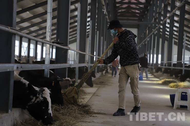 圖為旦增達瓦在奶牛養(yǎng)殖基地工作 攝影:趙耀