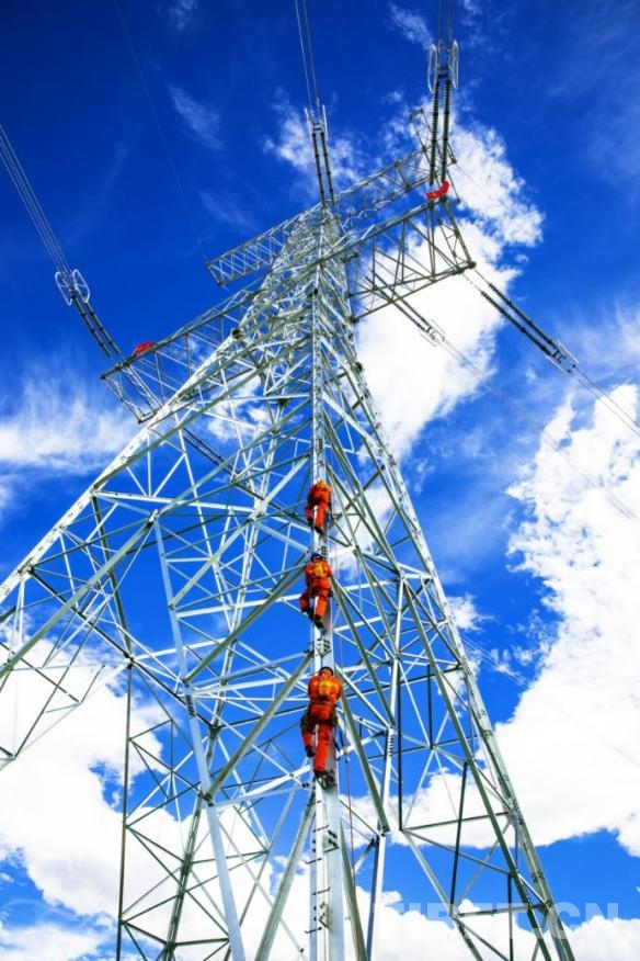 圖為國家電網(wǎng)公司員工在海拔4000米上塔作業(yè)