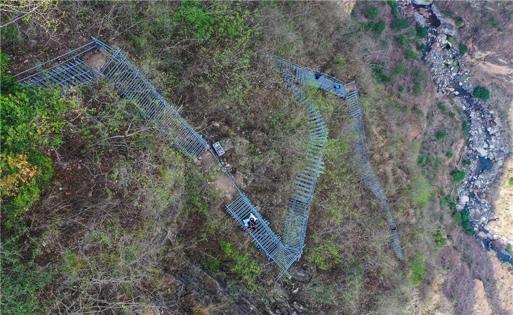 在四川涼山彝族自治州昭覺(jué)縣阿土列爾村的懸崖鋼梯上,“懸崖村”村民沿著鋼梯下山(5月13日攝,無(wú)人機(jī)照片)。新華社記者 王曦 攝
