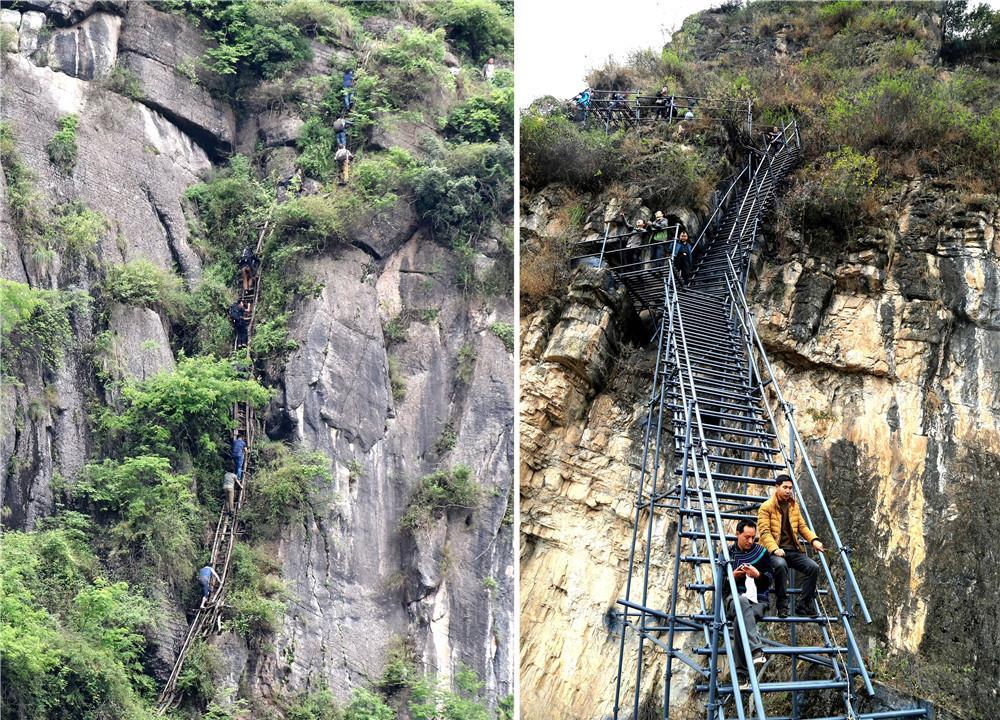 拼版照片:左圖為通往四川涼山彝族自治州昭覺(jué)縣阿土列爾村的簡(jiǎn)易藤梯(2016年5月14日攝);右圖為改建后的鋼梯(2017年12月5日攝)。新華社發(fā)(阿克鳩射 攝)