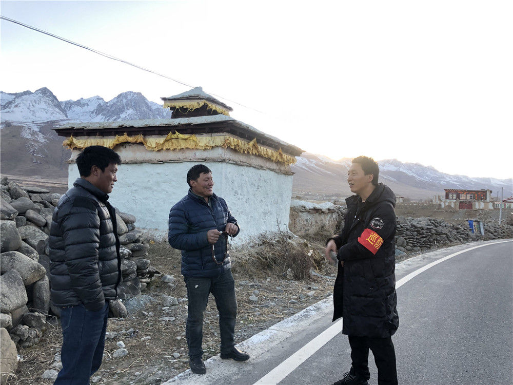 生前擔(dān)任甘孜州甘孜縣夏拉卡村駐村第一書(shū)記的馬伍薩(右)在巡防路上和村民交流(資料照片)。新華社發(fā)