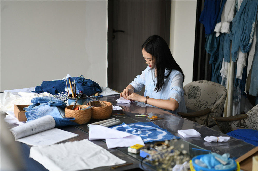 在四川省德陽(yáng)市旌陽(yáng)區(qū)高槐村扎染工作室,一名扎染愛(ài)好者在學(xué)習(xí)扎染技藝(6月14日攝)。新華社記者 王曦 攝