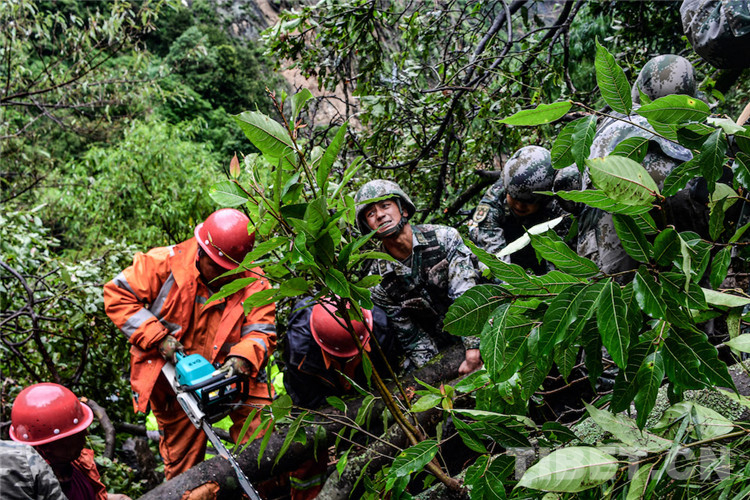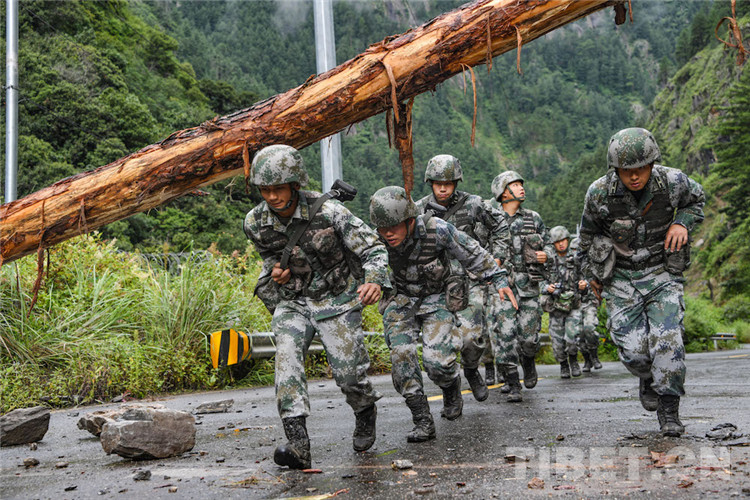 “山體滑坡帶下來的亂石和粗大的樹干擋住了去路,塌方面積不大,現在挖掘機正在作業(yè),跟當地人員溝通,他們說預計下午能搶通。” 巴桑爬上塌方的亂石堆觀察后,跑回來跟帶隊的副營長張為鵬報告情況。
