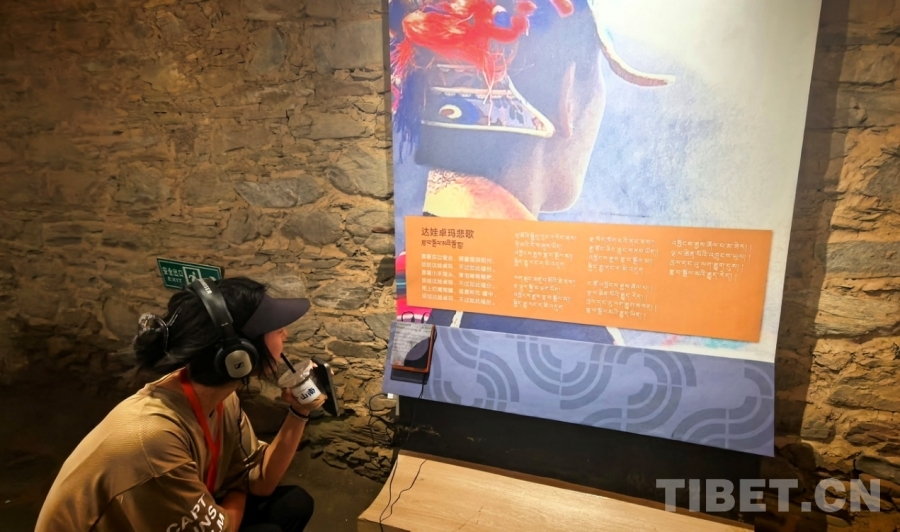 圖為游客參觀強吉莊園公共文化活動中心時通過影音設(shè)備聆聽歌曲《達(dá)娃卓瑪悲歌》 攝影:劉莉