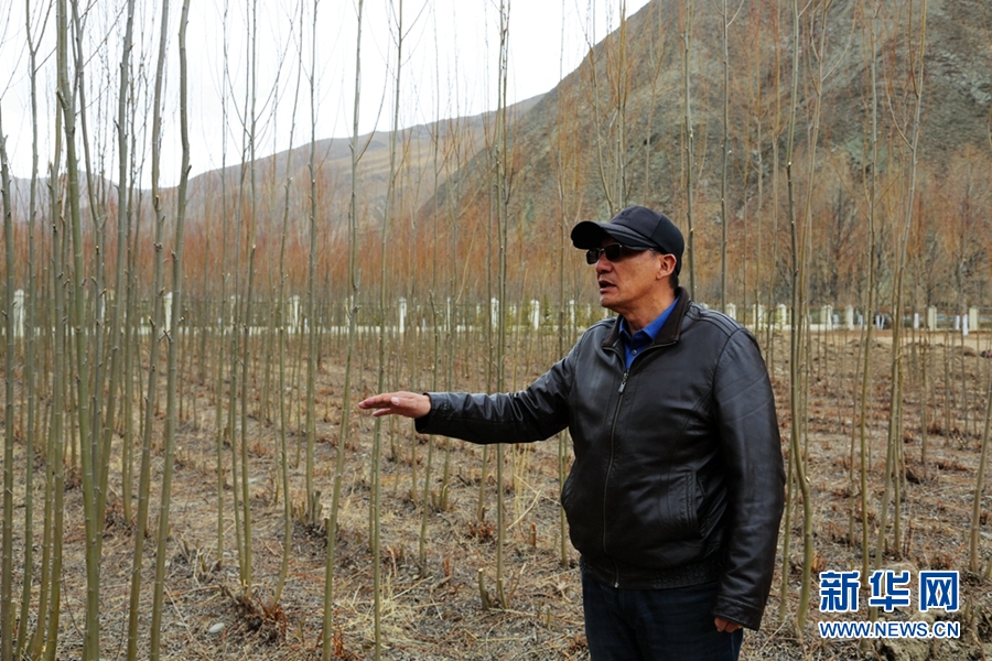昂江多杰正在向記者介紹情況,身后是茂密的藏柳林。新華網(wǎng) 卡婭梅朵 攝