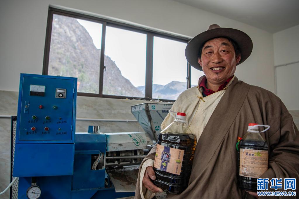 2021年3月23日,在昌都市江達(dá)縣崗?fù)墟?zhèn)崗?fù)写宓那逵图庸S,永紅在展示清油產(chǎn)品。新華社記者 孫非 攝