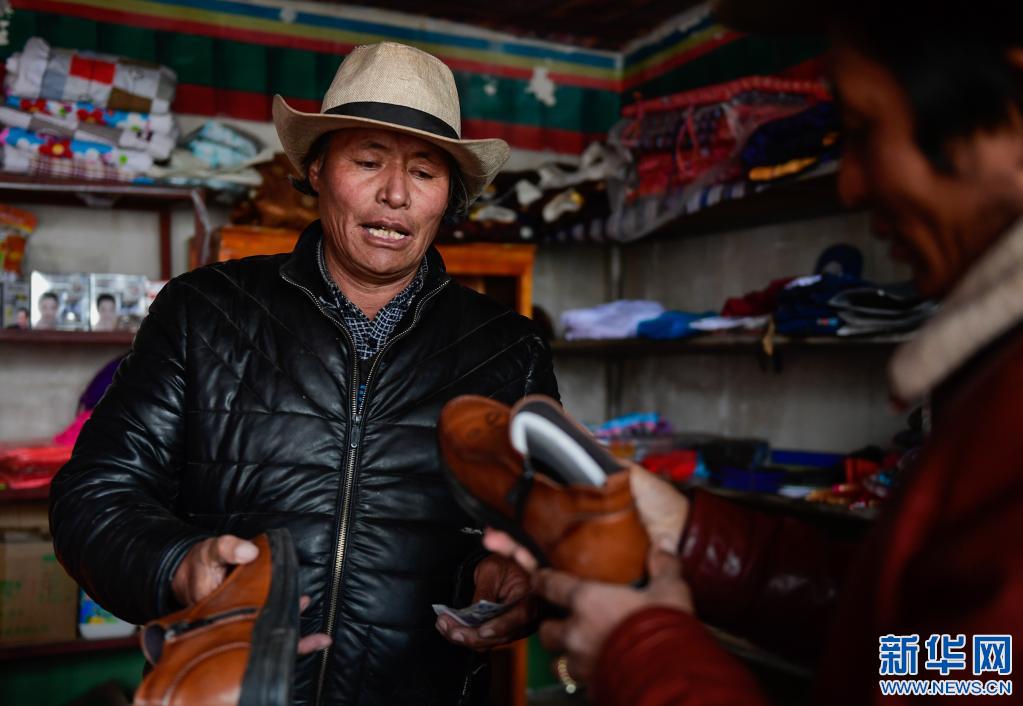 2018年3月15日,西藏阿里地區(qū)改則縣物瑪鄉(xiāng)搶古村村民阿祖(左)在合作社商店內(nèi)銷售皮鞋。新華社發(fā) 劉東君 攝