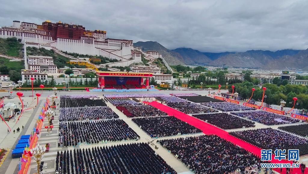 這是8月19日拍攝的慶祝西藏和平解放70周年大會現(xiàn)場。當(dāng)日,西藏各族各界干部群眾2萬多人歡聚在拉薩布達(dá)拉宮廣場,熱烈慶祝西藏和平解放70周年。新華社記者 覺果 攝