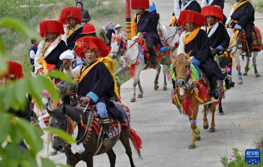 易地扶貧搬遷新村——西藏山南市加查縣冷達(dá)鄉(xiāng)共康村村民們身著盛裝歡度“望果節(jié)”(7月9日攝)。新華社記者 張汝鋒 攝