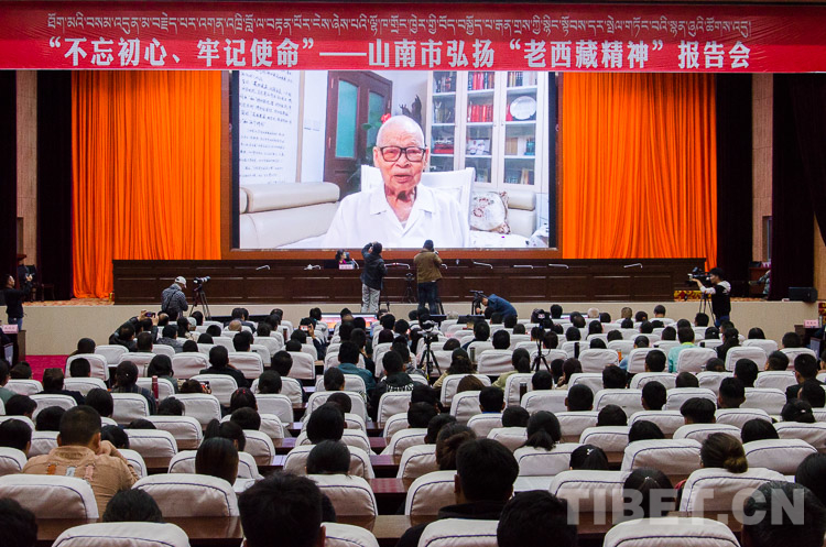 圖為報(bào)告會(huì)上,98歲高齡的西藏自治區(qū)黨委原第一書記陰法唐向活動(dòng)發(fā)來祝福視頻 攝影:趙耀