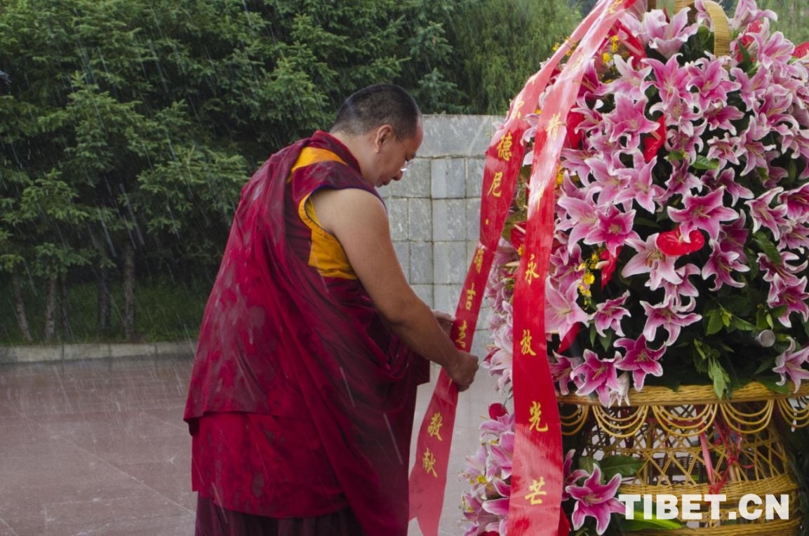 圖為班禪冒雨向革命烈士敬獻花籃 攝影:歐帆