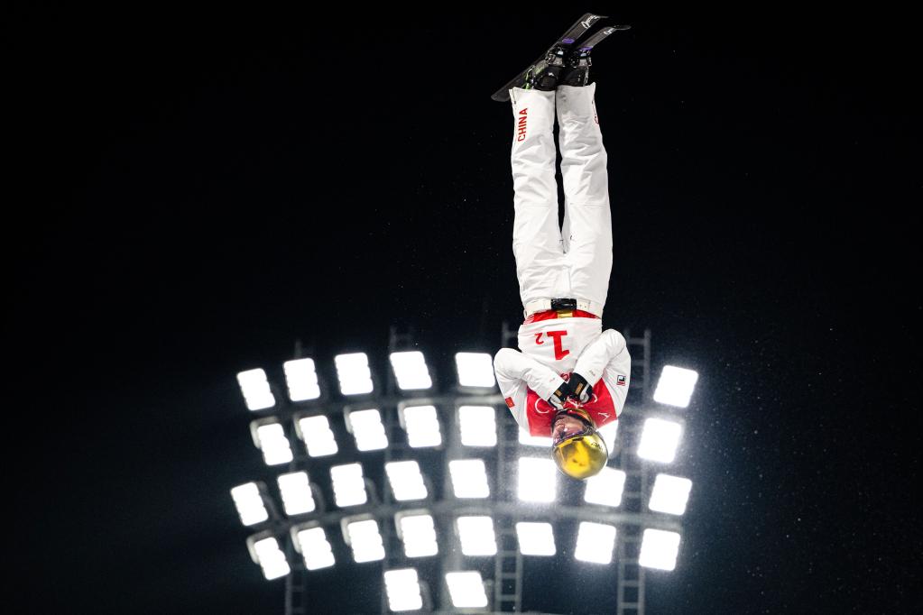 2月10日,中國(guó)隊(duì)選手賈宗洋在北京冬奧會(huì)自由式滑雪空中技巧混合團(tuán)體決賽比賽中。新華社記者肖藝九攝