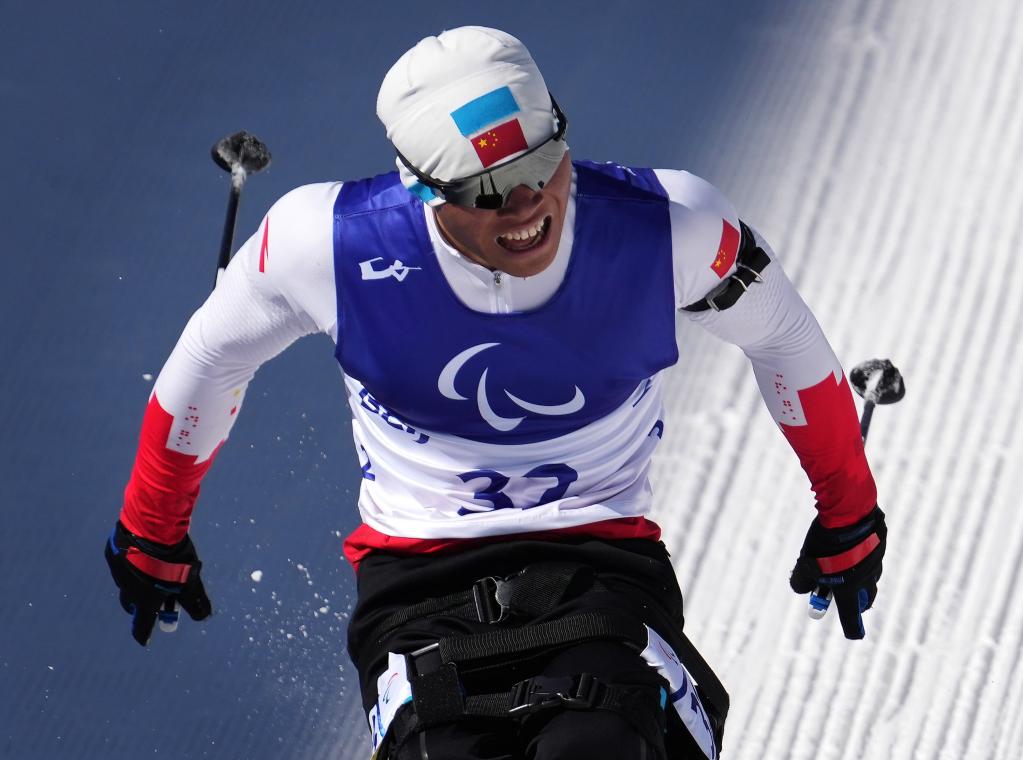 3月8日,冠軍中國(guó)選手劉夢(mèng)濤在北京2022年冬殘奧會(huì)冬季兩項(xiàng)男子中距離(坐姿)比賽后慶祝。新華社記者萬(wàn)象攝