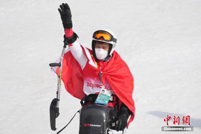 3月10日,中國(guó)選手梁子路揮手致意。當(dāng)日,北京2022年冬殘奧會(huì)殘奧高山滑雪男子大回轉(zhuǎn)-坐姿決賽在延慶國(guó)家高山滑雪中心舉行,中國(guó)選手梁子路以2分00秒92的成績(jī)摘得銅牌。 中新社記者 楊華峰 攝