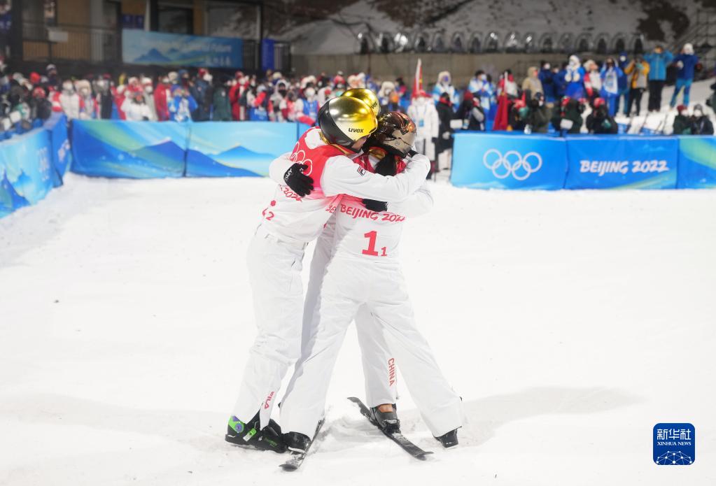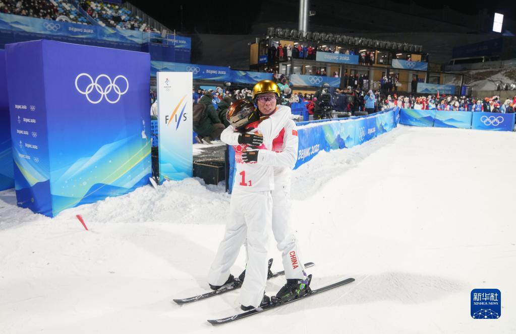 2月10日,中國(guó)隊(duì)選手徐夢(mèng)桃與賈宗洋(右)賽后擁抱。新華社記者 費(fèi)茂華 攝