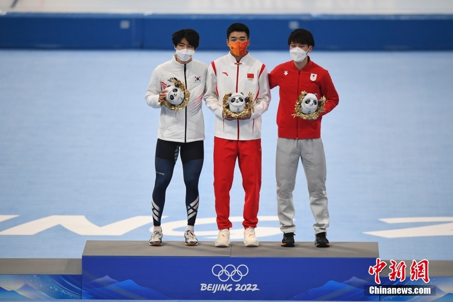2月12日,北京2022年冬奧會(huì)速度滑冰男子500米決賽在國(guó)家速滑館“冰絲帶”舉行。中國(guó)選手高亭宇以34.32秒的成績(jī)打破奧運(yùn)會(huì)紀(jì)錄,奪得冠軍。這是中國(guó)首次在冬奧會(huì)速度滑冰男子項(xiàng)目獲得金牌。圖為高亭宇(中)在頒發(fā)紀(jì)念品儀式上。 中新社記者 李駿 攝
