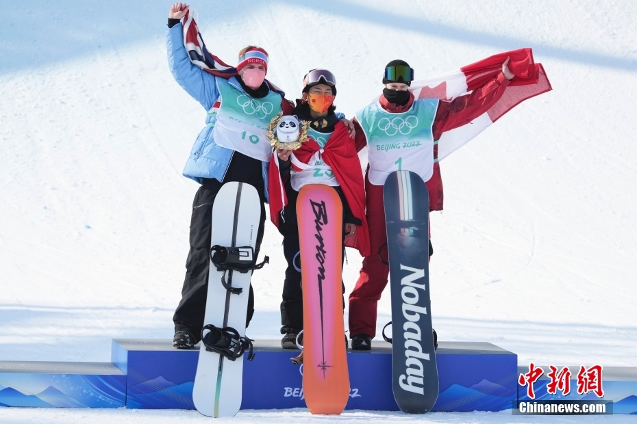 2月15日,北京2022年冬奧會單板滑雪男子大跳臺決賽在首鋼滑雪大跳臺舉行,中國選手蘇翊鳴(中)獲得冠軍,挪威選手蒙斯·勒伊斯韋蘭 (左)獲得亞軍,加拿大選手馬克斯·帕羅特(右)獲得季軍。圖為頒發(fā)紀(jì)念品儀式。 中新社記者 毛建軍 攝
