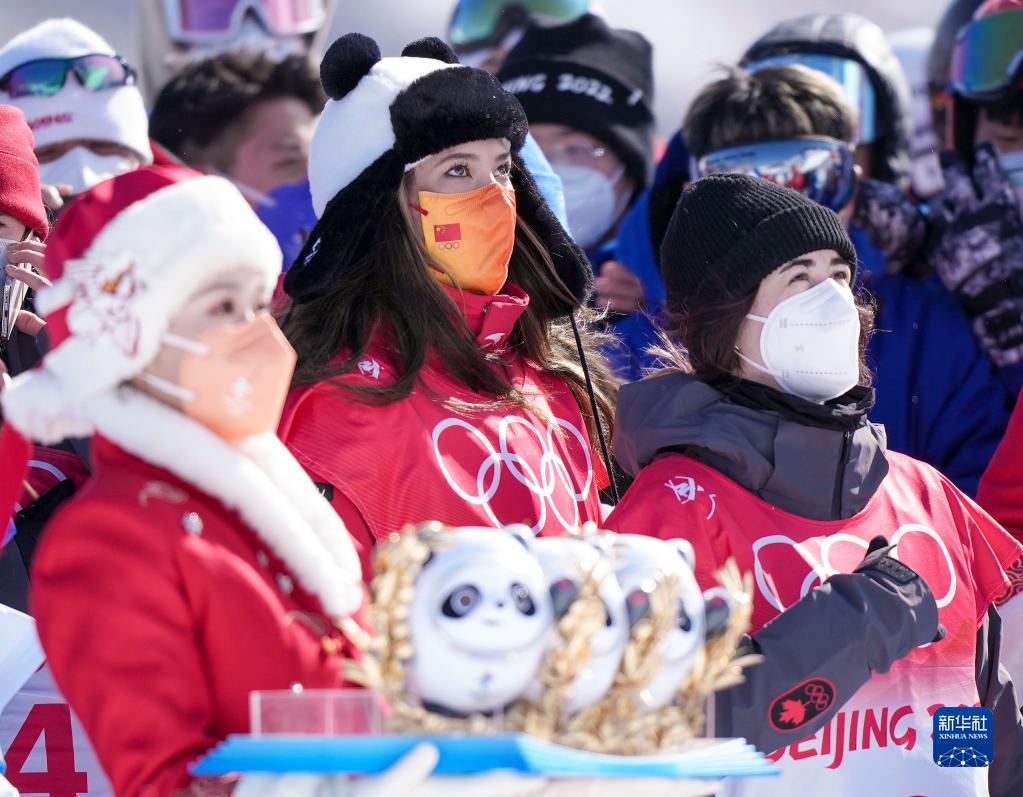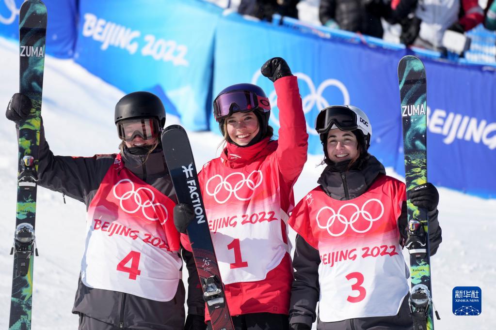 2月18日,獲得冠軍的中國隊(duì)選手谷愛凌(中)、獲得亞軍的加拿大選手凱茜·夏普(左)和獲得季軍的加拿大選手蕾切爾·卡克在比賽后慶祝。新華社記者 王昊飛 攝