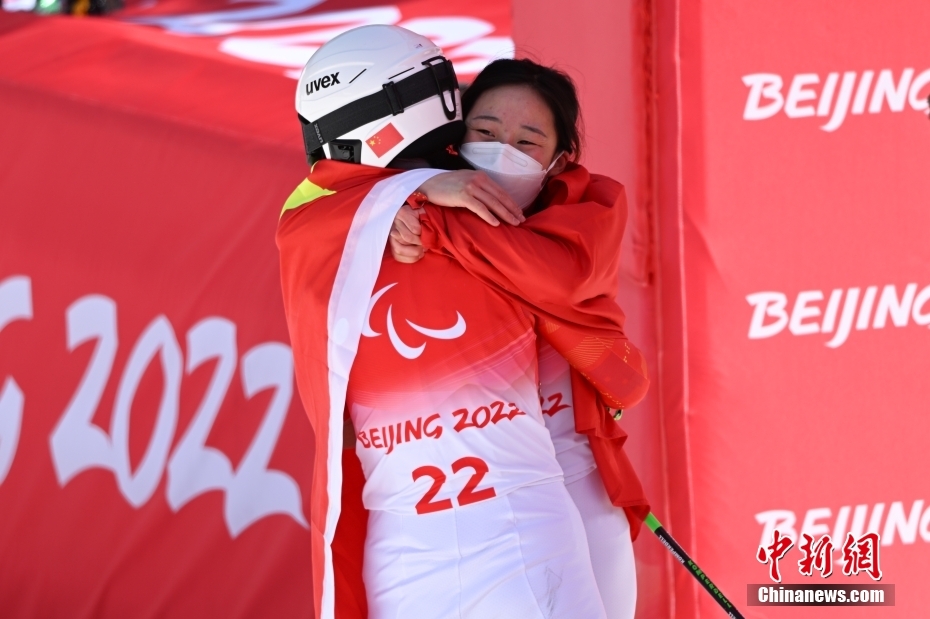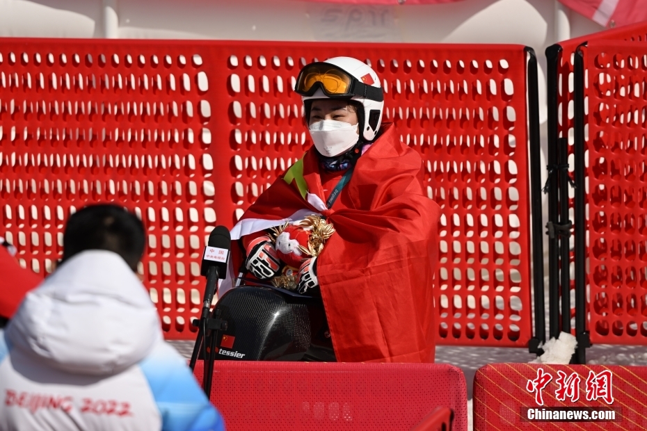 3月6日,中國選手張夢秋賽后慶祝勝利。當日,北京2022年冬殘奧會殘奧高山滑雪女子超級大回轉 - 站姿決賽在延慶國家高山滑雪中心舉行,中國選手張夢秋奪得金牌。 中新社記者 劉冉陽 攝