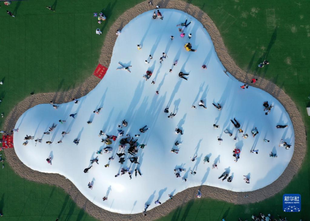 在江西省贛州市章貢區(qū)沙河鎮(zhèn)的羅坑體育特色小鎮(zhèn),游客在體驗戶外蹦床項目(2020年11月15日攝,無人機照片)。新華社記者 彭昭之 攝