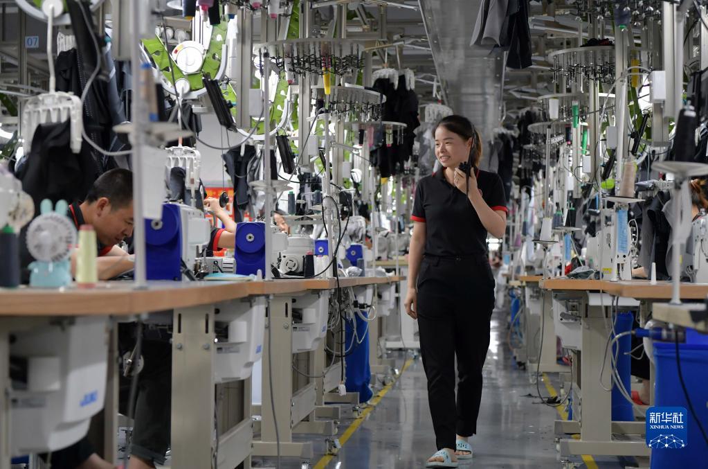 在江西省于都縣一家服裝生產(chǎn)基地內(nèi),生產(chǎn)小組小組長在巡查生產(chǎn)線(2020年7月17日攝)。新華社記者 彭昭之 攝