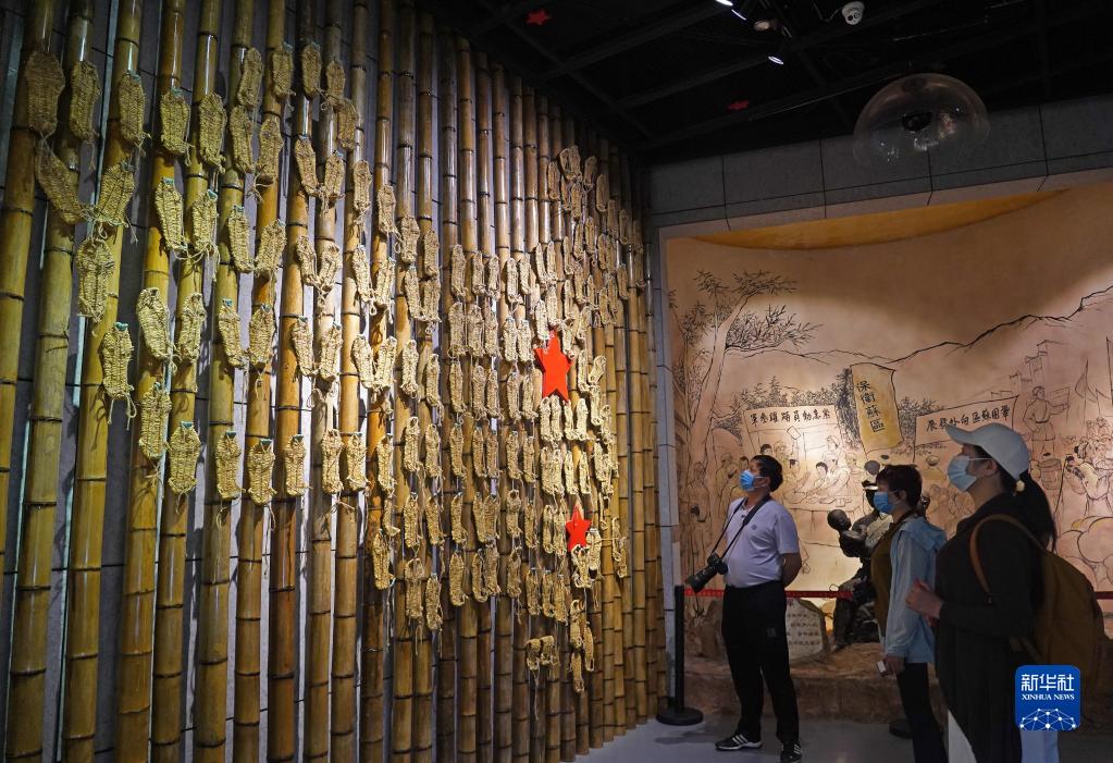 在江西省于都縣中央紅軍長征出發(fā)紀念館,游客在參觀草鞋組成的“草鞋墻”(4月30日攝)。新華社記者 萬象 攝