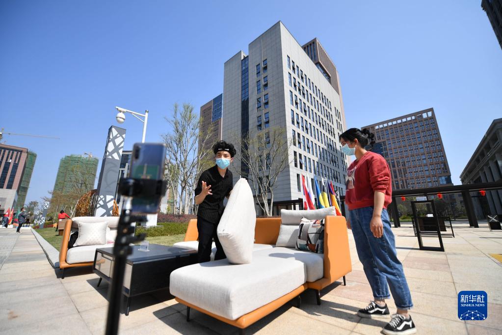 在江西省贛州市南康區(qū)跨境電商產(chǎn)業(yè)園,員工通過手機直播的形式推銷家具(2020年2月26日攝)。新華社記者 胡晨歡 攝