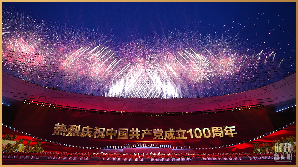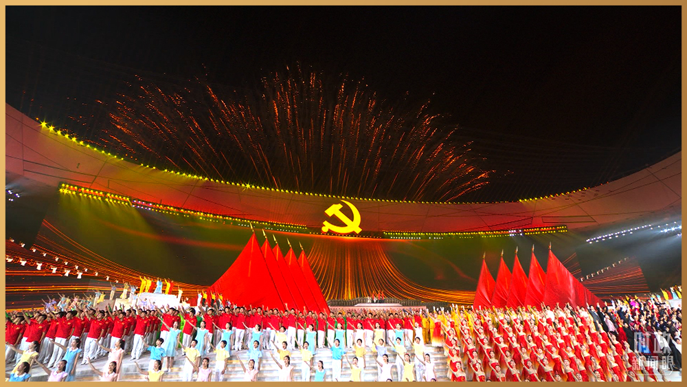 情景交響歌舞《人民至上》,再現(xiàn)舉國動(dòng)員、全民戰(zhàn)“疫”。鼓樂歌舞節(jié)目《新的天地》,一百面空中大鼓與地面巨型大鼓遙相呼應(yīng)。在主題曲《領(lǐng)航》的旋律中,高達(dá)16米的金色黨徽在國家體育場莊嚴(yán)升起。演出過程中,絢爛的焰火一次次盛放在國家體育場上空,并迅速在網(wǎng)上引發(fā)刷屏。