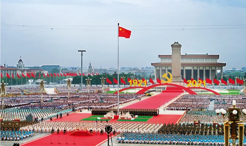 2021年7月1日上午,慶祝中國共產黨成立100周年大會在北京天安門廣場隆重舉行。習近平總書記在大會上莊嚴宣告,我們實現了全面建成小康社會的第一個百年奮斗目標。圖為慶祝大會現場?!±铘?攝