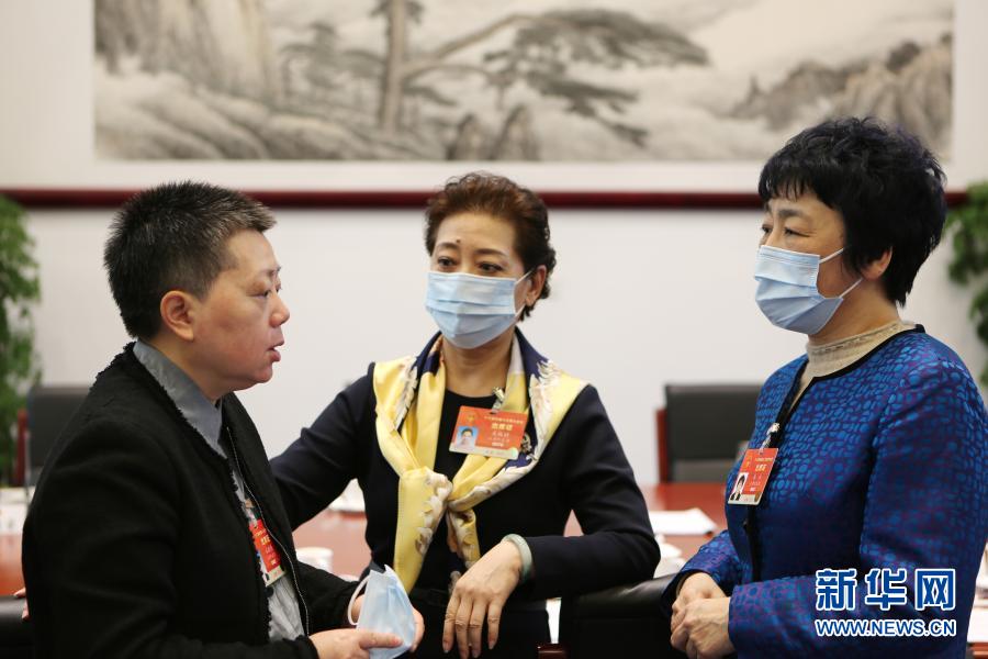 3月6日,十三屆全國人大四次會議天津代表團的孔曉艷代表(左)、關牧村代表(中)和馬杰代表在會議間隙交流討論。新華社記者 吳雨 攝