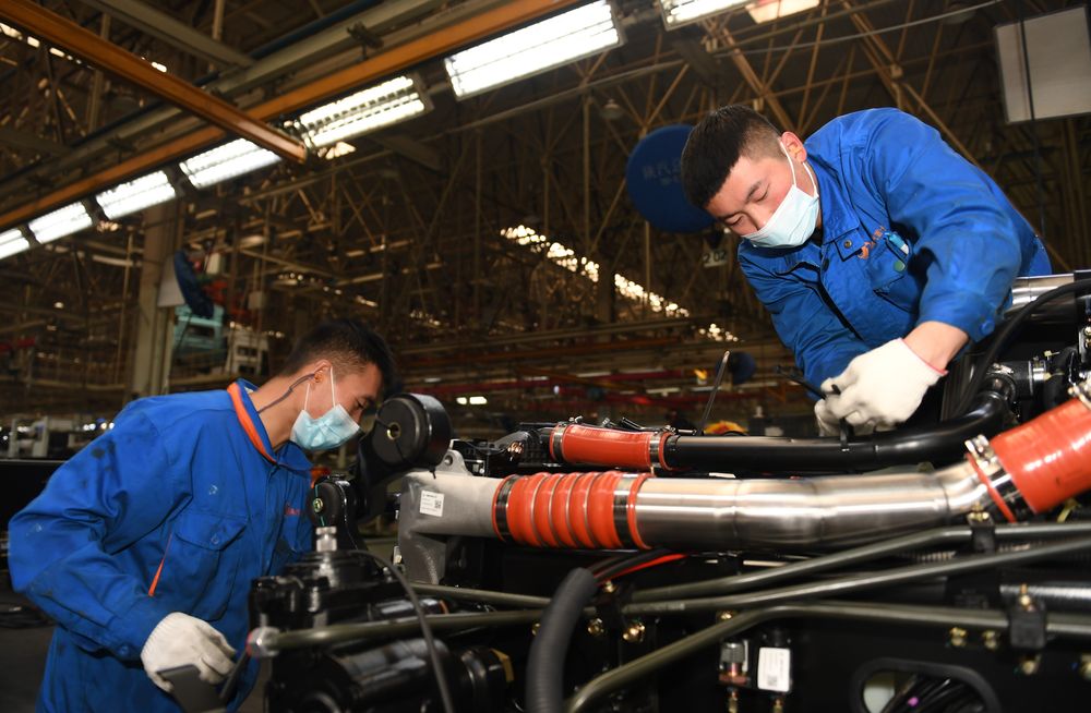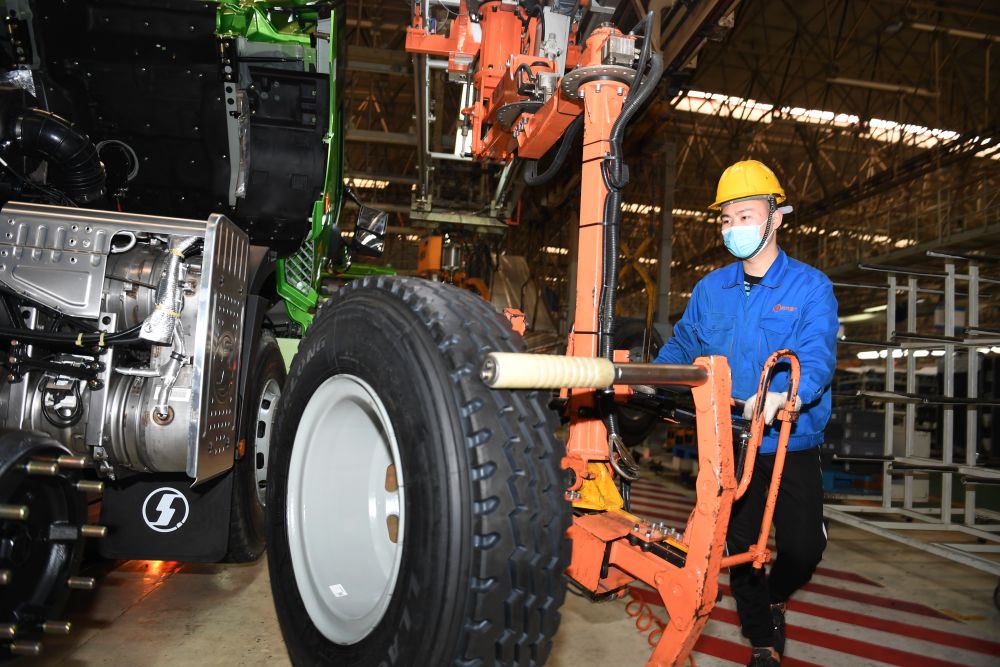 1月20日,工人在陜西汽車控股集團有限公司總裝車間進(jìn)行重型卡車裝配。