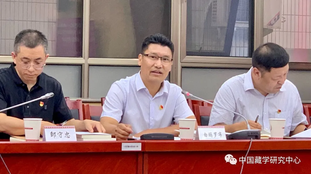 6月18日下午,中國(guó)藏學(xué)研究中心與西藏自治區(qū)在京掛職干部臨時(shí)黨支部舉行聯(lián)合主題黨日活動(dòng),學(xué)習(xí)貫徹習(xí)近平總書記在黨史學(xué)習(xí)教育動(dòng)員大會(huì)上的重要講話精神,學(xué)習(xí)《西藏和平解放與繁榮發(fā)展》白皮書,并就加強(qiáng)合作交流,推動(dòng)藏學(xué)研究更好為西藏長(zhǎng)治久安和高質(zhì)量發(fā)展服務(wù),推進(jìn)藏研中心建設(shè)國(guó)家涉藏高端智庫(kù)進(jìn)行座談交流。藏研中心黨組成員、各科研業(yè)務(wù)部門負(fù)責(zé)人、科研業(yè)務(wù)辦公室全體人員和17位西藏自治區(qū)在京掛職干部參加活動(dòng)。座談?dòng)晌鞑卦诰炻毟刹颗R時(shí)黨支部書記、水利部建設(shè)司副司長(zhǎng)白瑪羅布主持,藏研中心黨組書記陳宗榮、總干事鄭堆出席活動(dòng)并講話。