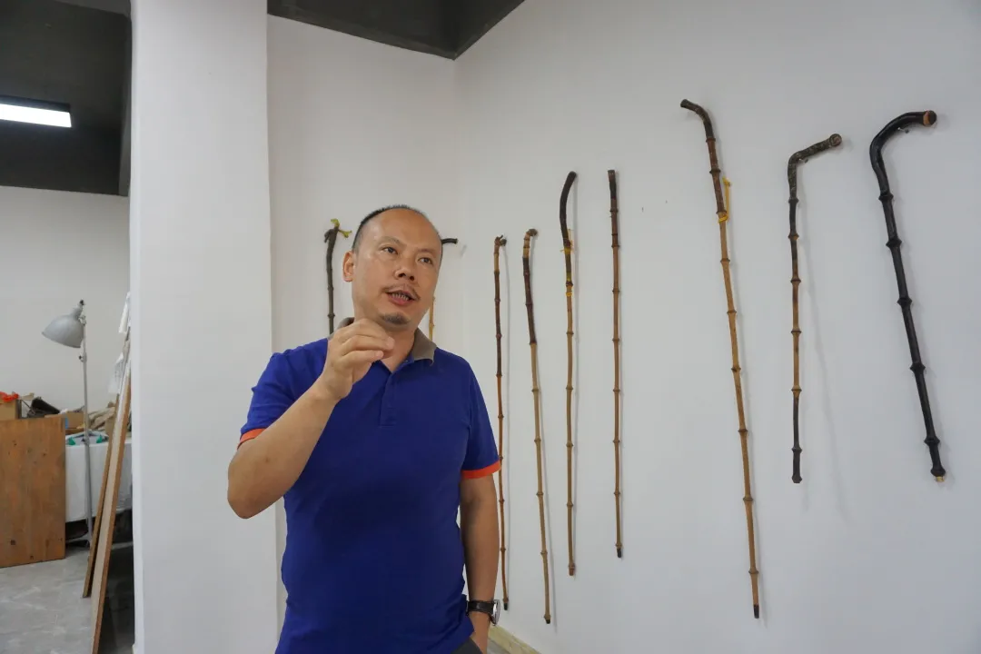 “我們考證了歷史文獻上的圖形,按照古人的圖譜,通過加熱來做出彎曲的造型。”趙彌指向固定在墻上的筇竹杖,介紹“筇竹杖”背后蘊含的文化及它在今時今日的意義,他詳細描述了筇竹杖漫長的制作流程,在正式制作前,要收集生長6年左右的竹子放在通風陰涼的地方一年之久,來自然揮發(fā)掉內部的水分糖分。