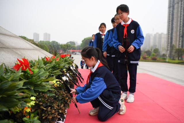 3月30日,長沙市長郡天心實(shí)驗(yàn)學(xué)校學(xué)生在湖南革命陵園烈士紀(jì)念碑前敬獻(xiàn)鮮花。