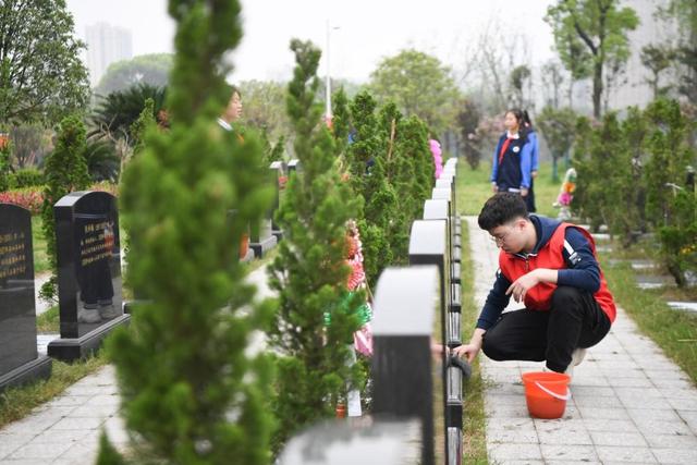 3月30日,志愿者在湖南革命陵園擦拭墓碑。