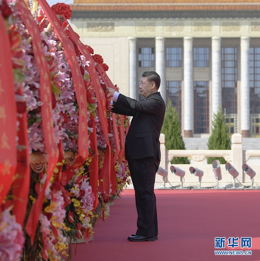 9月30日上午,黨和國家領(lǐng)導(dǎo)人習(xí)近平、李克強(qiáng)、栗戰(zhàn)書、汪洋、王滬寧、趙樂際、韓正、王岐山等來到北京天安門廣場,出席烈士紀(jì)念日向人民英雄敬獻(xiàn)花籃儀式。這是習(xí)近平整理花籃上的緞帶。 新華社記者 申宏 攝