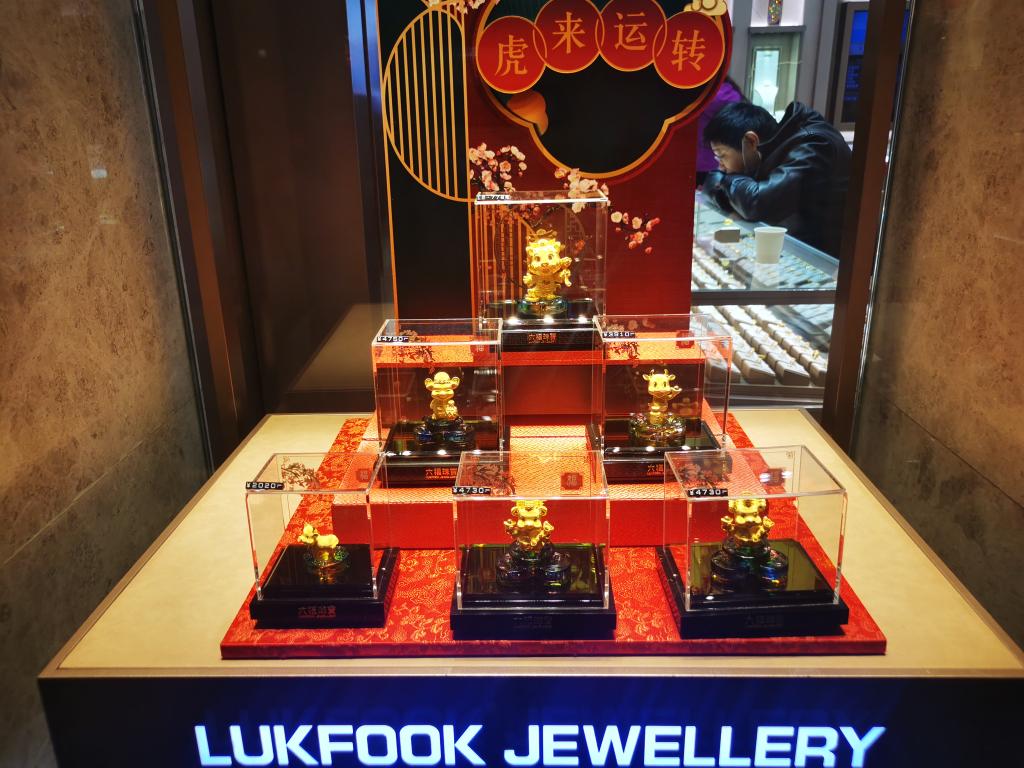 春節(jié)假期,黃金消費(fèi)市場(chǎng)也迎來(lái)旺季。為了把握虎年開(kāi)門(mén)紅,各大金飾品牌不約而同推出虎年金幣、金虎擺件、?;⒌鯄?、手鏈等應(yīng)時(shí)應(yīng)景新品。廣州天河城百貨一層聚集著各大金飾品牌數(shù)十個(gè)專(zhuān)柜,虎年賀歲飾品成為春節(jié)前后最受歡迎的產(chǎn)品?!袄匣⒁忸^好,很多人愿意開(kāi)年買(mǎi)求個(gè)好運(yùn),再加上相比去年,今年的金價(jià)有所下滑,我們也加大了打折促銷(xiāo)的力度,多重因素推動(dòng)春節(jié)期間生肖金飾銷(xiāo)售火爆?!睂?zhuān)柜銷(xiāo)售人員告訴記者。