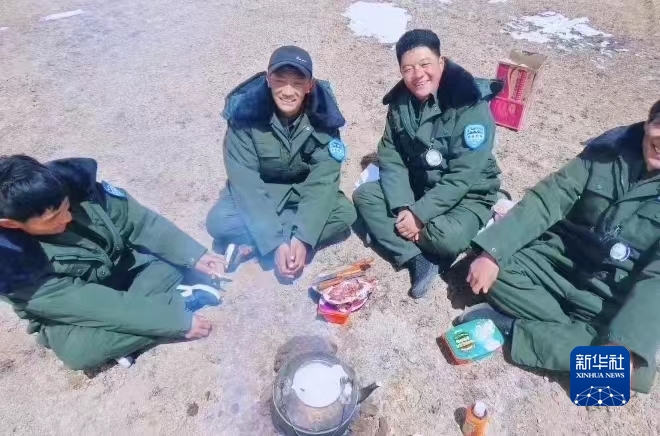 雙湖縣管護員在巡邏時用餐。(受訪者提供)