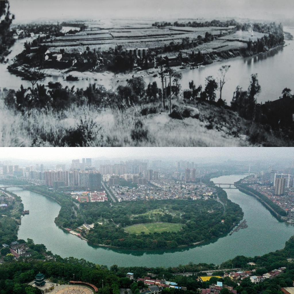 拼圖照片,上圖為1981年時百色市面貌(資料圖片,百色市檔案館提供);下圖為同一地點現(xiàn)在的百色市面貌(5月8日攝,無人機照片)。
