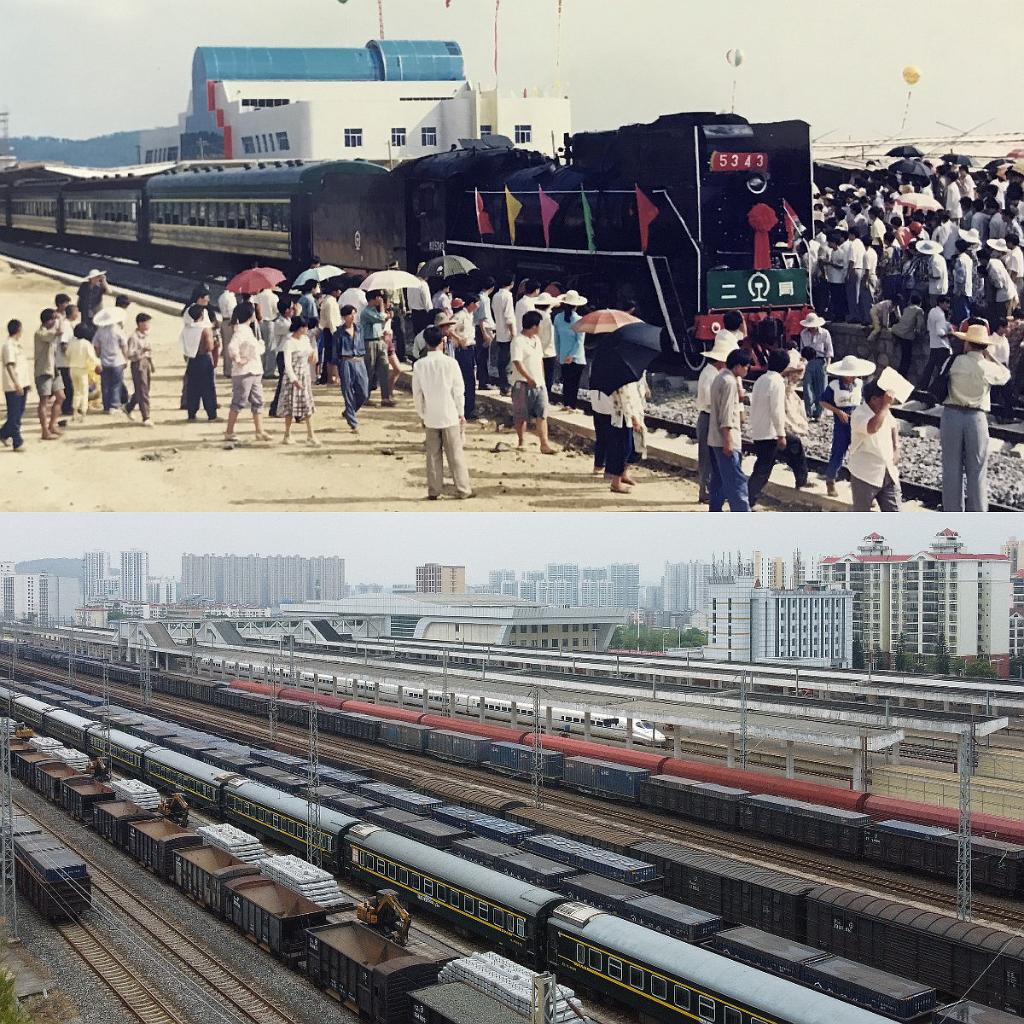 拼圖照片,上圖為1995年國慶節(jié)一列火車開進百色市火車站(資料圖片,中國鐵路南寧局集團有限公司提供);下圖為現(xiàn)在的百色市火車站客貨列運行景觀(5月8日攝,無人機照片)。新華社記者張愛林攝