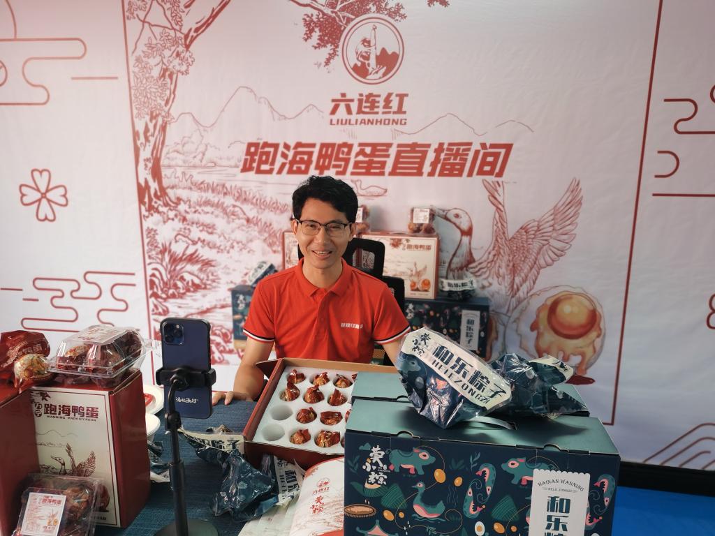 六連村食品廠負(fù)責(zé)人莫澤錦通過(guò)網(wǎng)絡(luò)直播銷售咸鴨蛋。 新華社記者趙葉蘋攝