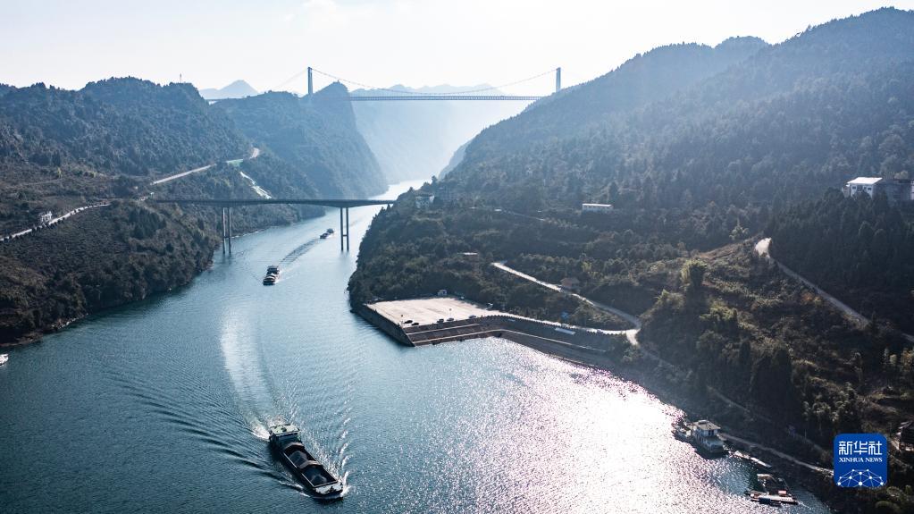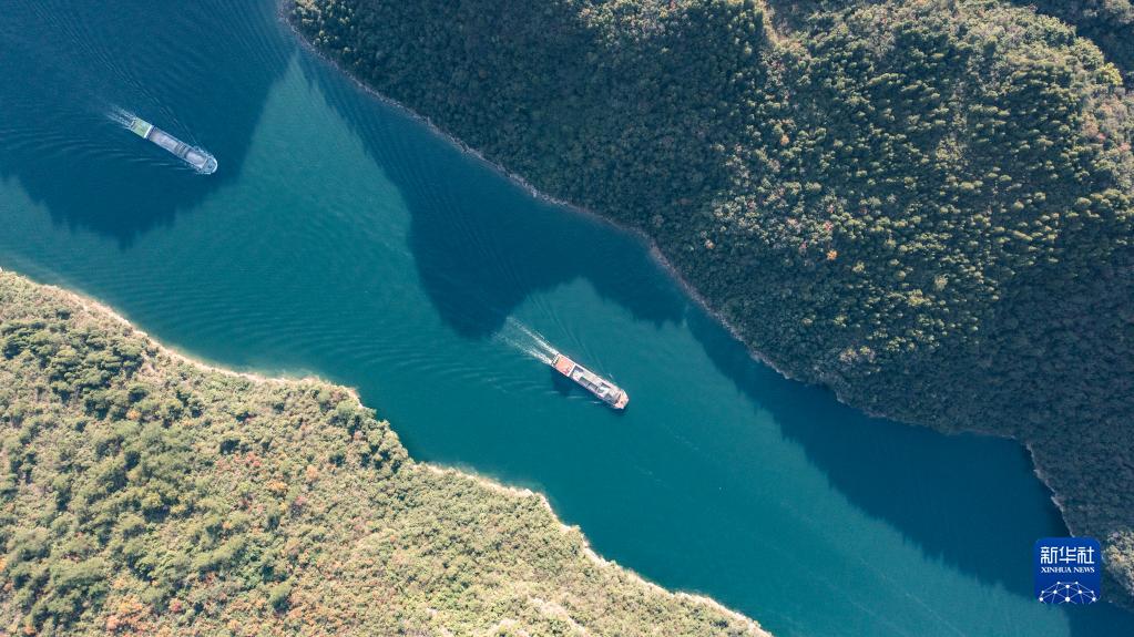 運載磷礦石的貨船沿烏江航道順流航行(2021年11月18日攝,無人機照片)。新華社記者 陶亮 攝