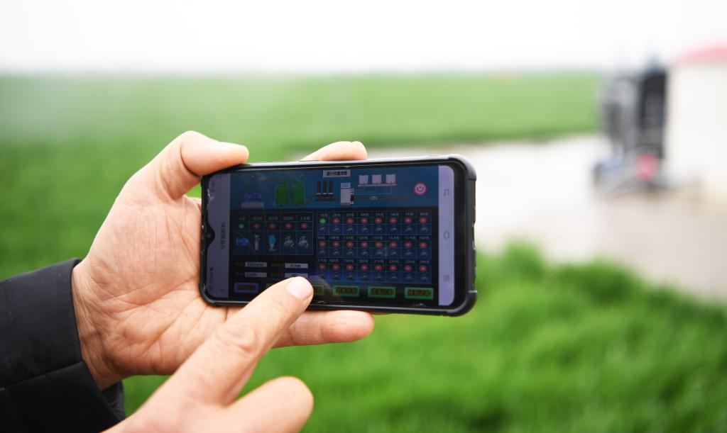 3月22日,種糧大戶(hù)邱守先正在使用手機(jī)操控設(shè)備對(duì)麥田進(jìn)行灌溉。新華社記者 張浩然 攝