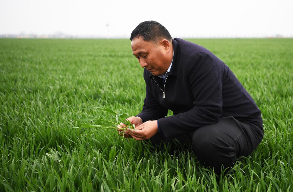 3月22日,種糧大戶(hù)劉天華在商水縣高標(biāo)準(zhǔn)農(nóng)田示范區(qū)查看自家小麥長(zhǎng)勢(shì)。新華社記者 張浩然 攝