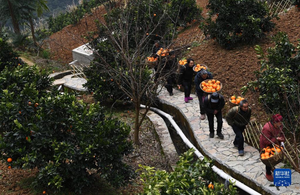 毛相林(右二)和下莊村村民在背運剛采摘的柑橘(2021年1月7日攝)。新華社記者 王全超 攝