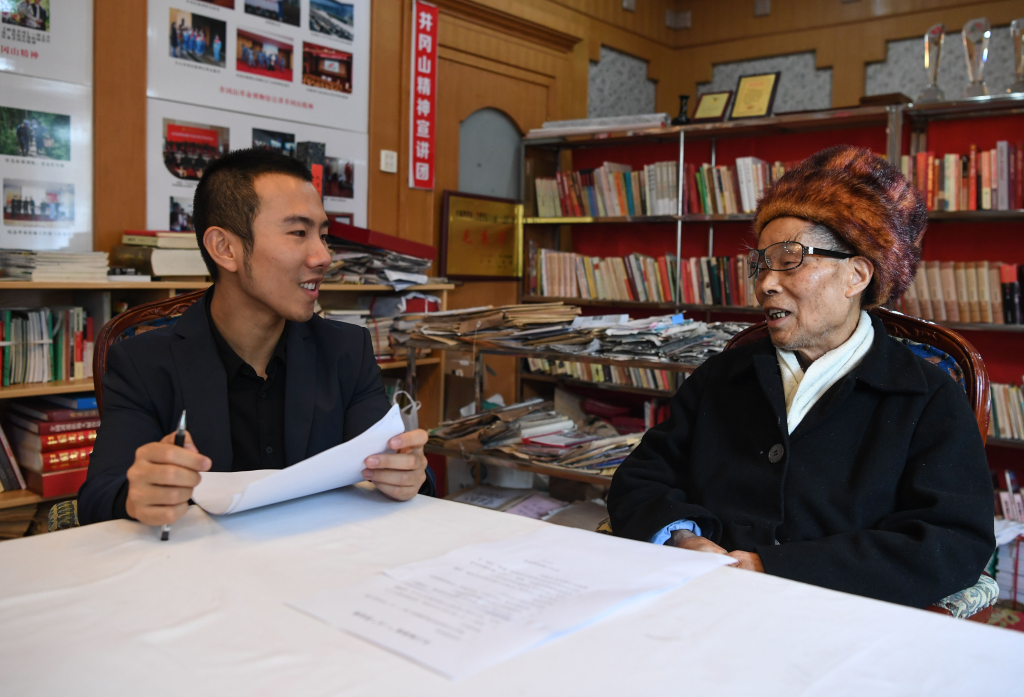 毛秉華(右)生前和孫子毛浩夫?qū)W習、探討井岡山革命歷史。新華社記者 申宏 攝