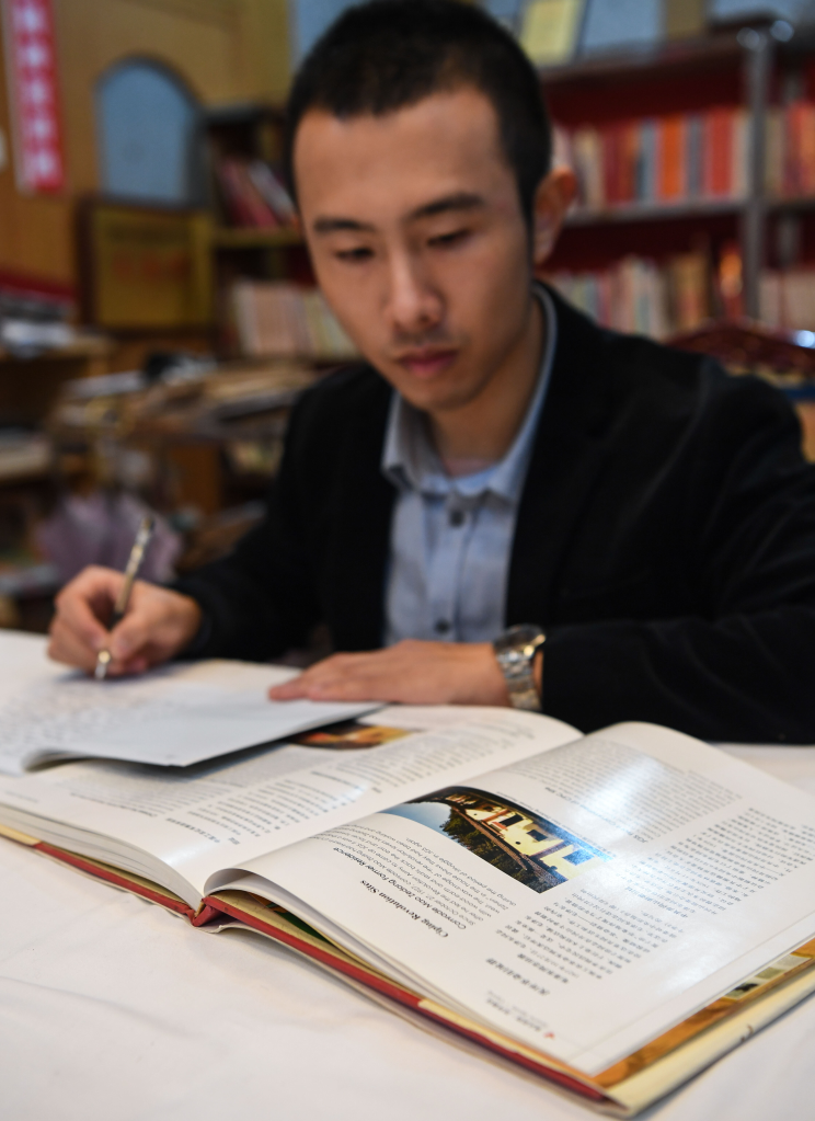 毛浩夫在研讀有關井岡山的英文資料,豐富英文講解素材。新華社記者 申宏 攝